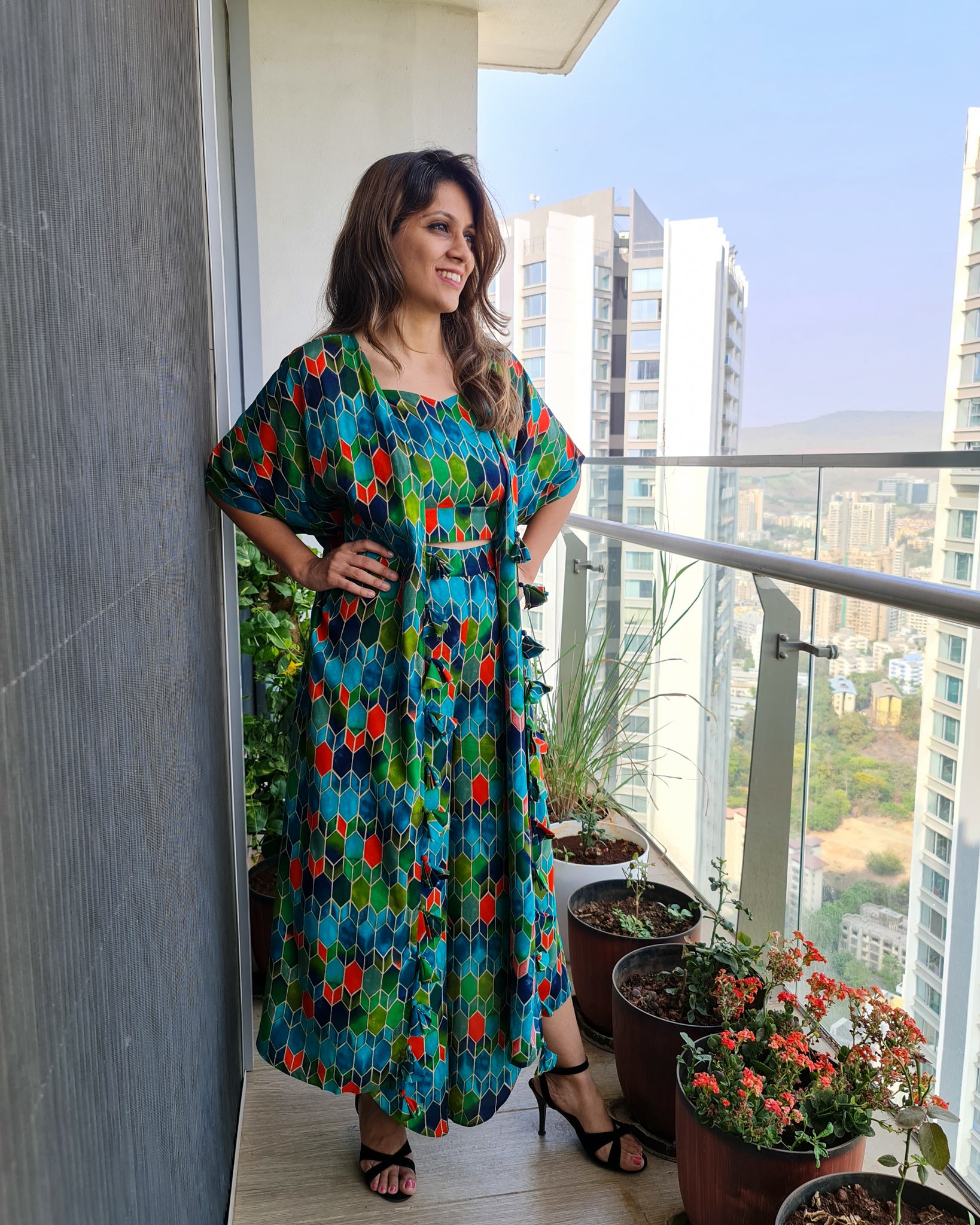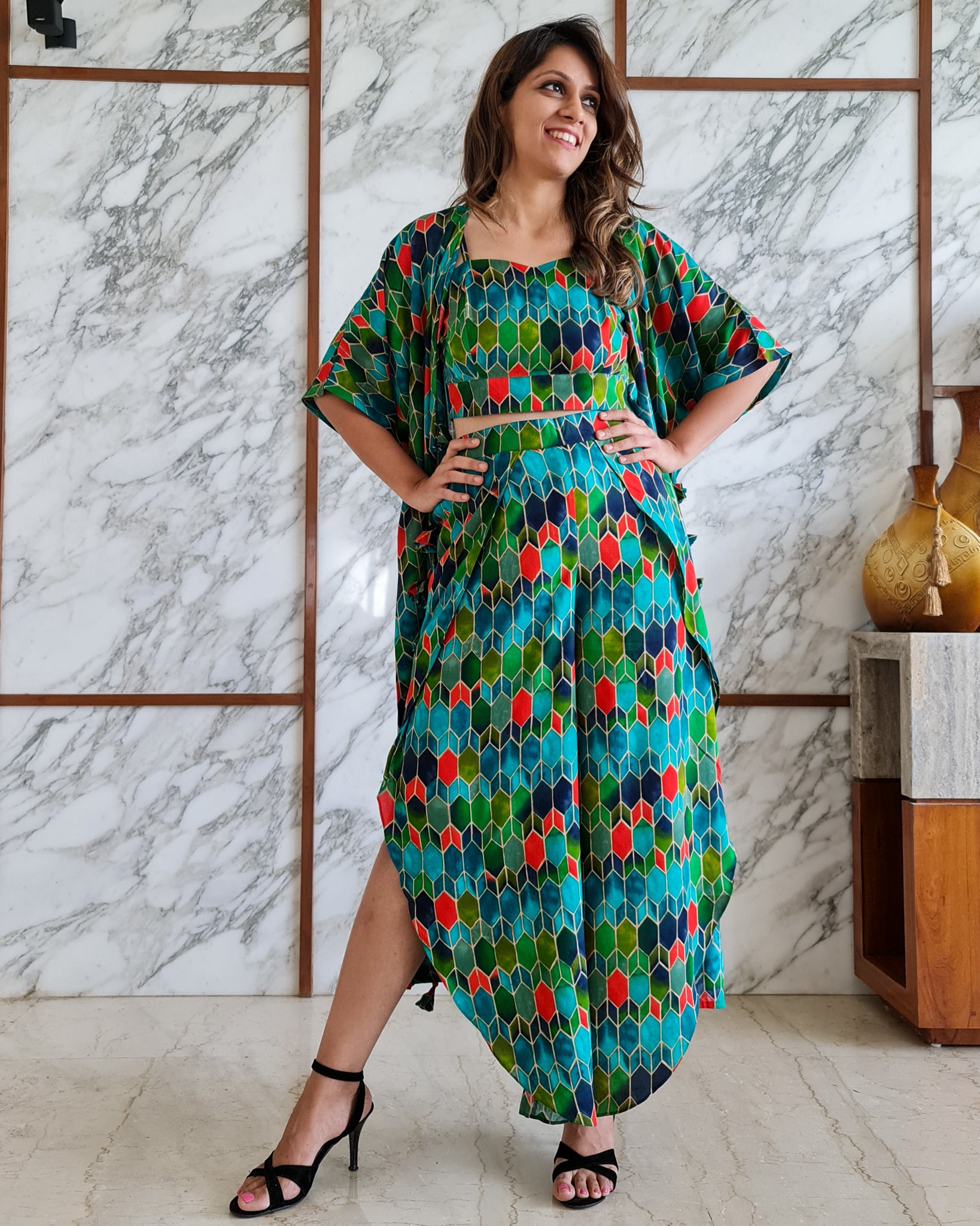 Bright, funky and an instant mood-lifter- this 3-piece set comprises of a spaghetti bustier with adjustable straps, dhoti pants with slits and long jacket with tassel detailing. Wear it to up your fusion game, with or without the jacket.
