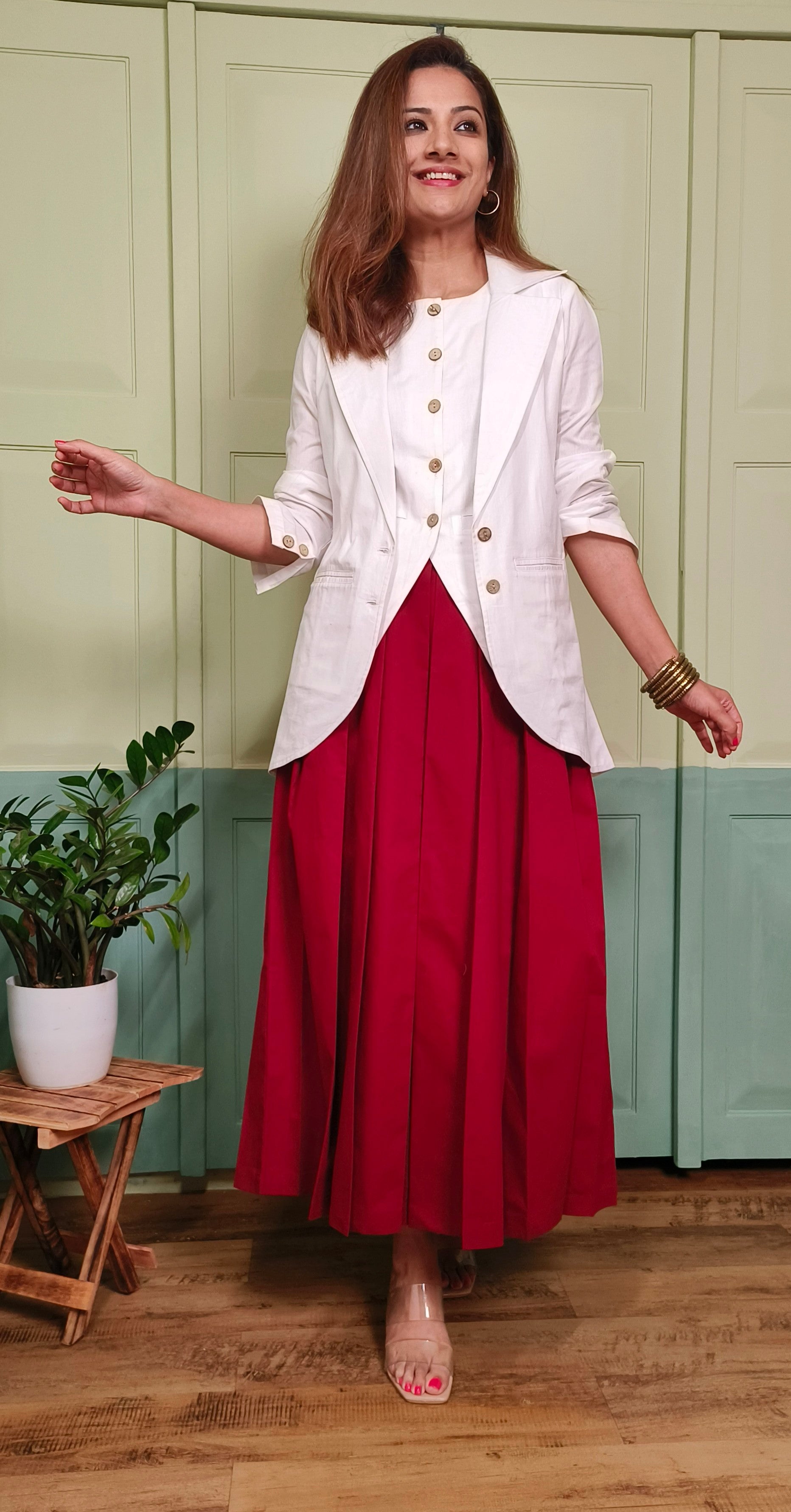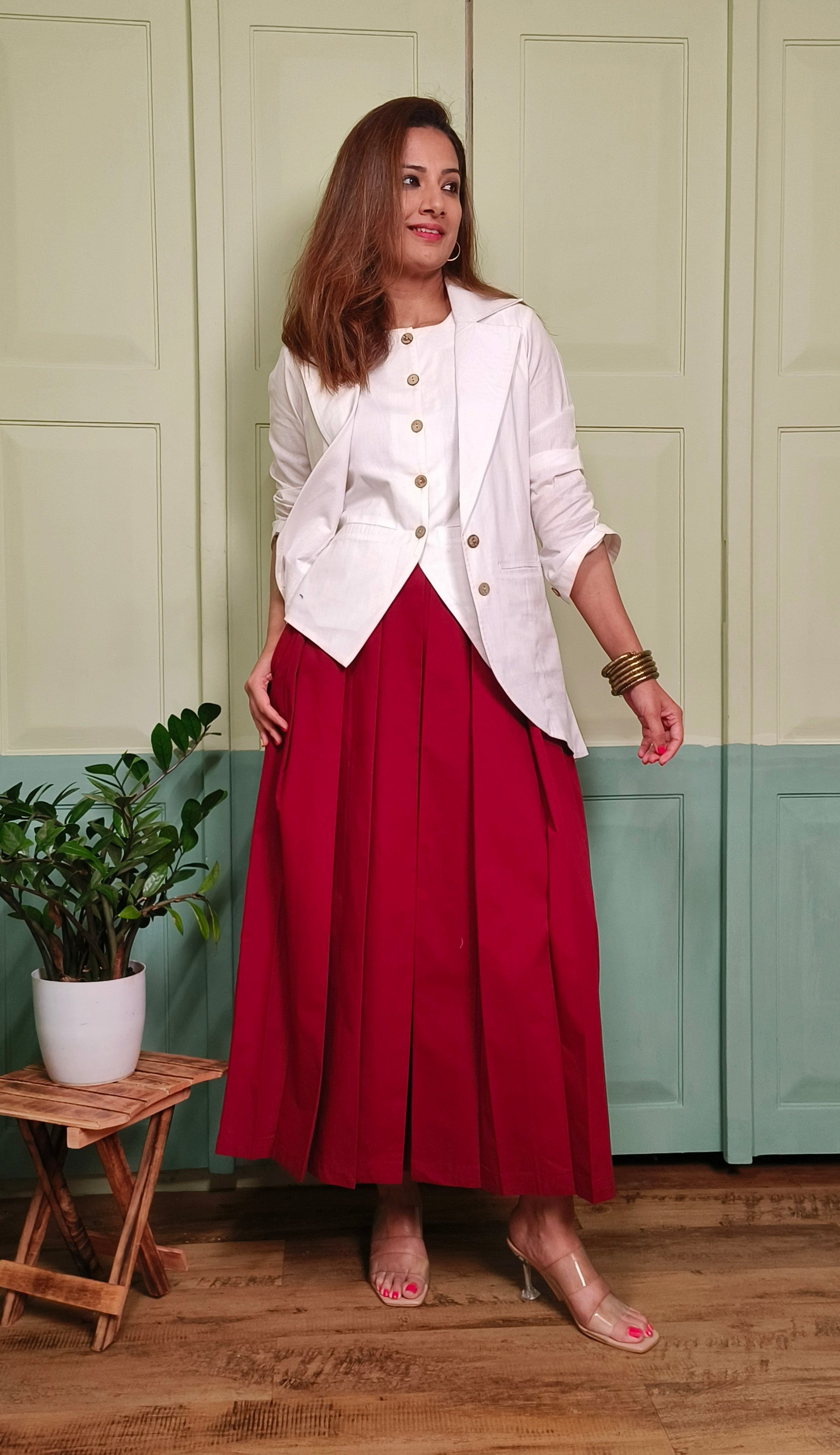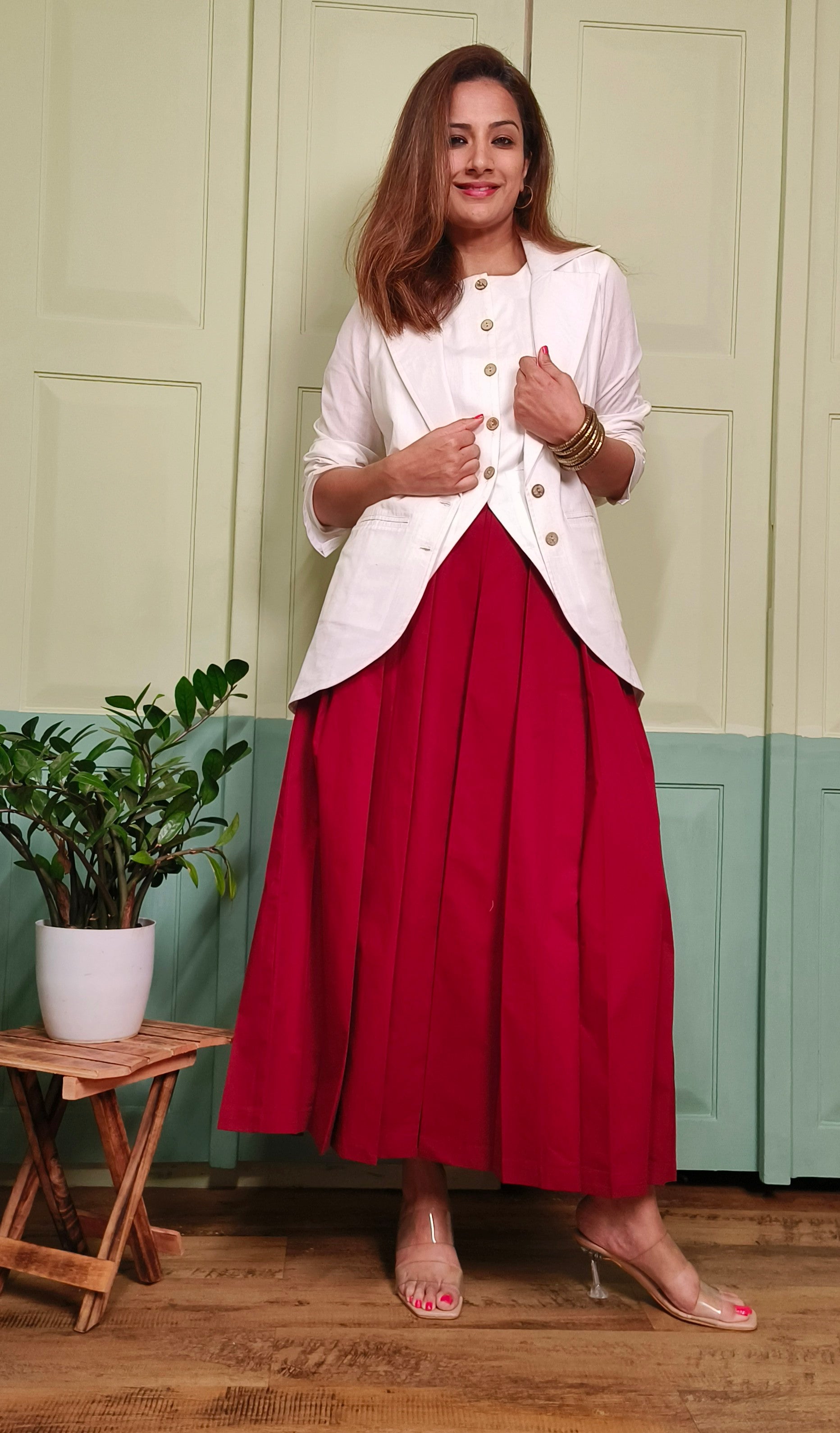 A power-packed pleated skirt paired with a sharp vest and blazer—this one’s all about boss-lady charm with a soft twist. The flow of the skirt meets the crispness of tailoring, creating a striking balance of feminine and fierce. Own the room, effortlessly.