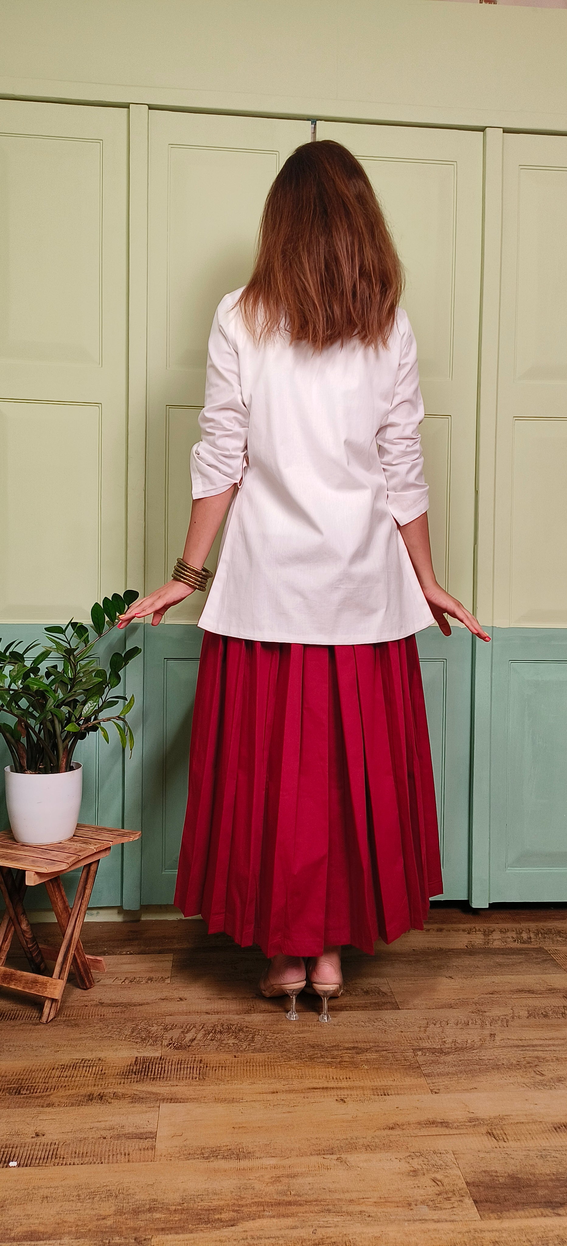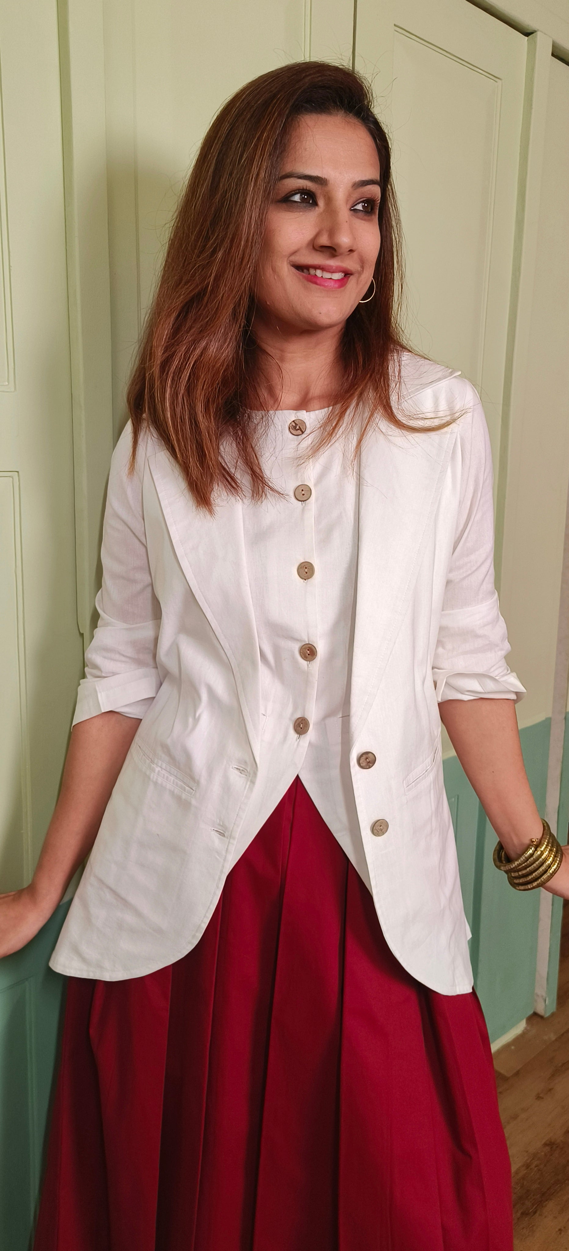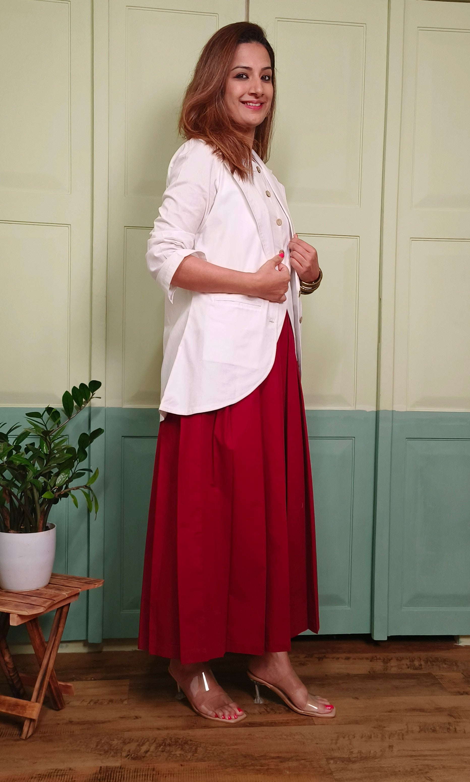 A power-packed pleated skirt paired with a sharp vest and blazer—this one’s all about boss-lady charm with a soft twist. The flow of the skirt meets the crispness of tailoring, creating a striking balance of feminine and fierce. Own the room, effortlessly.