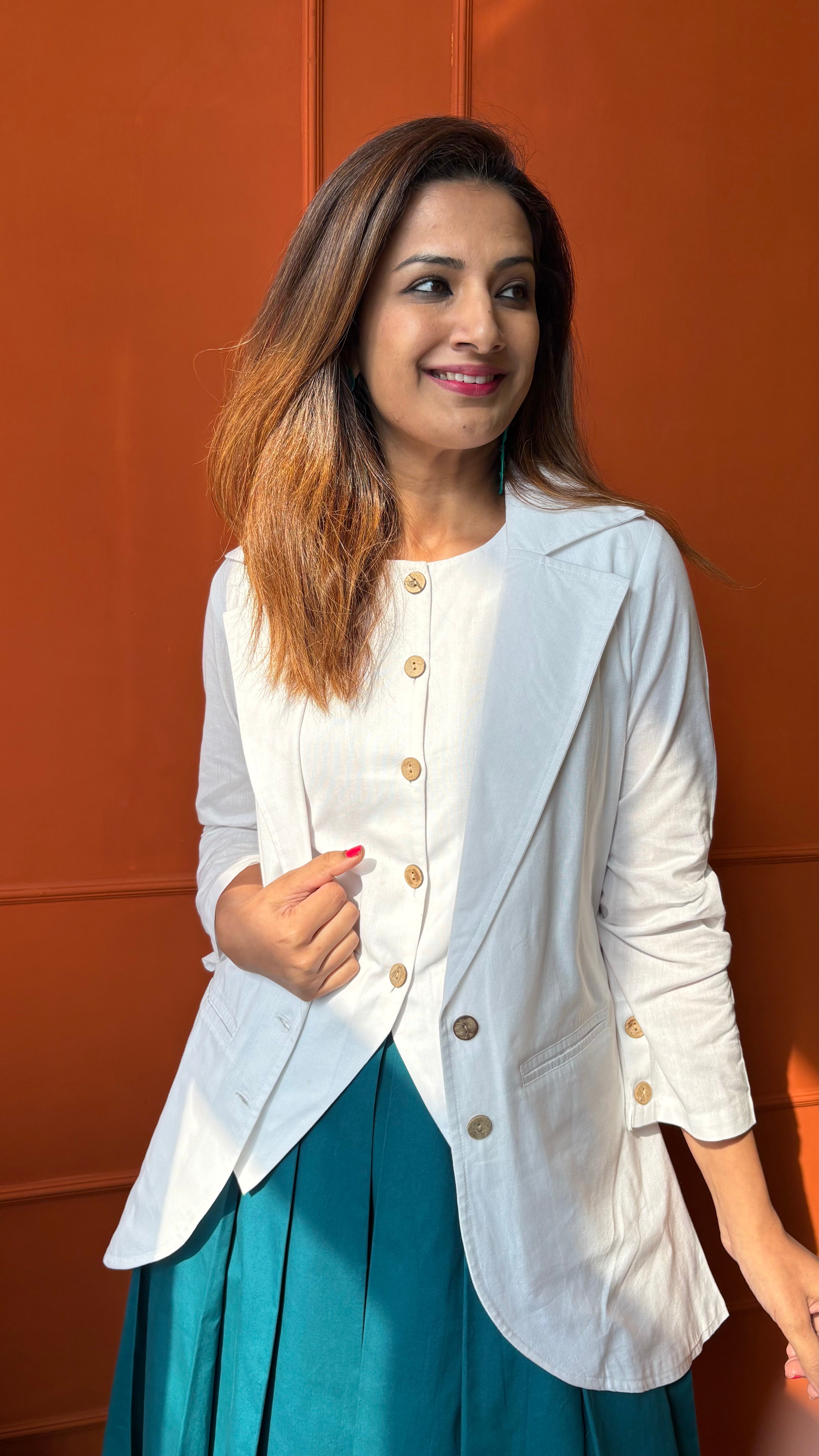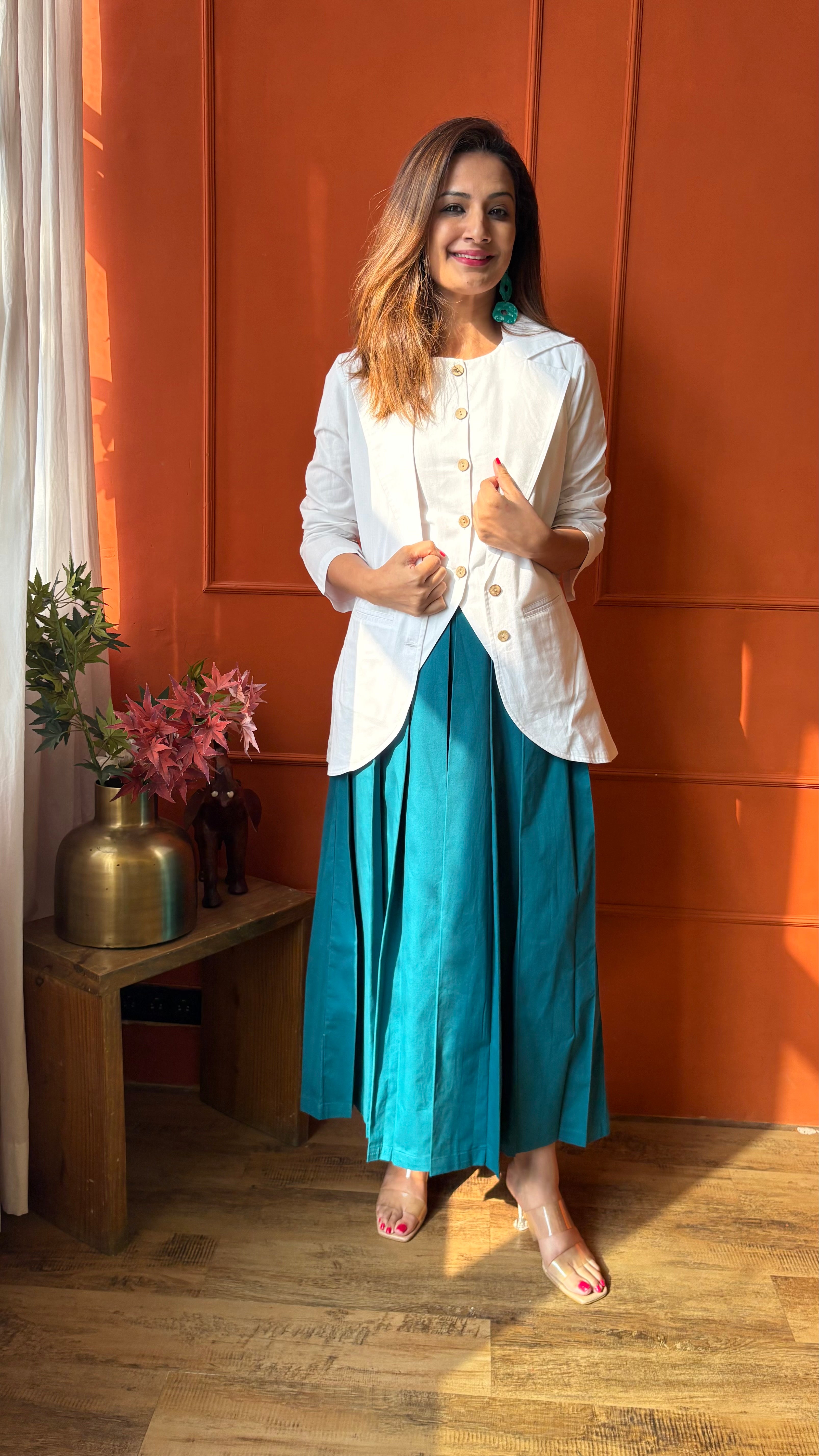 A power-packed pleated skirt paired with a sharp vest and blazer—this one’s all about boss-lady charm with a soft twist. The flow of the skirt meets the crispness of tailoring, creating a striking balance of feminine and fierce. Own the room, effortlessly.