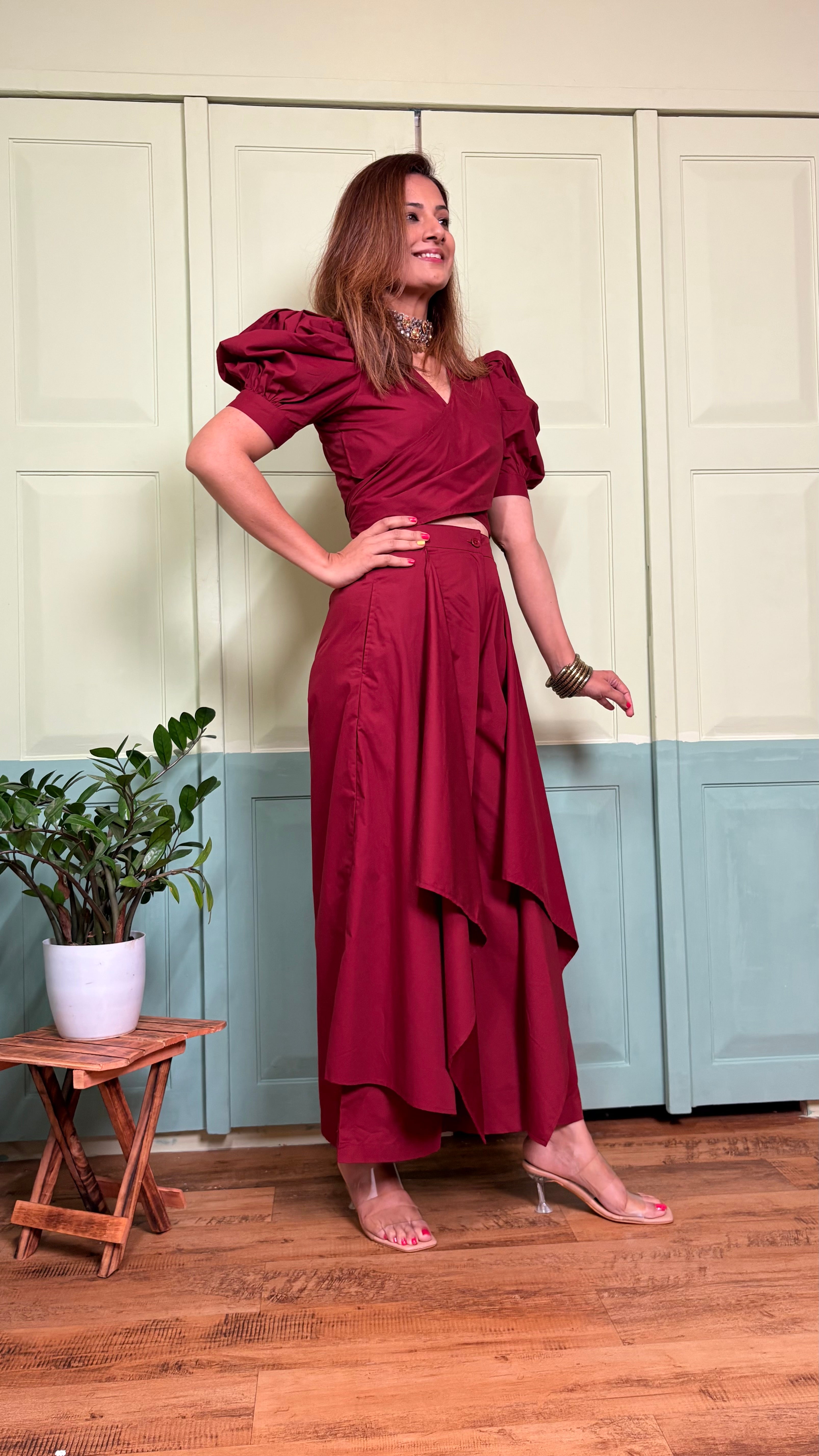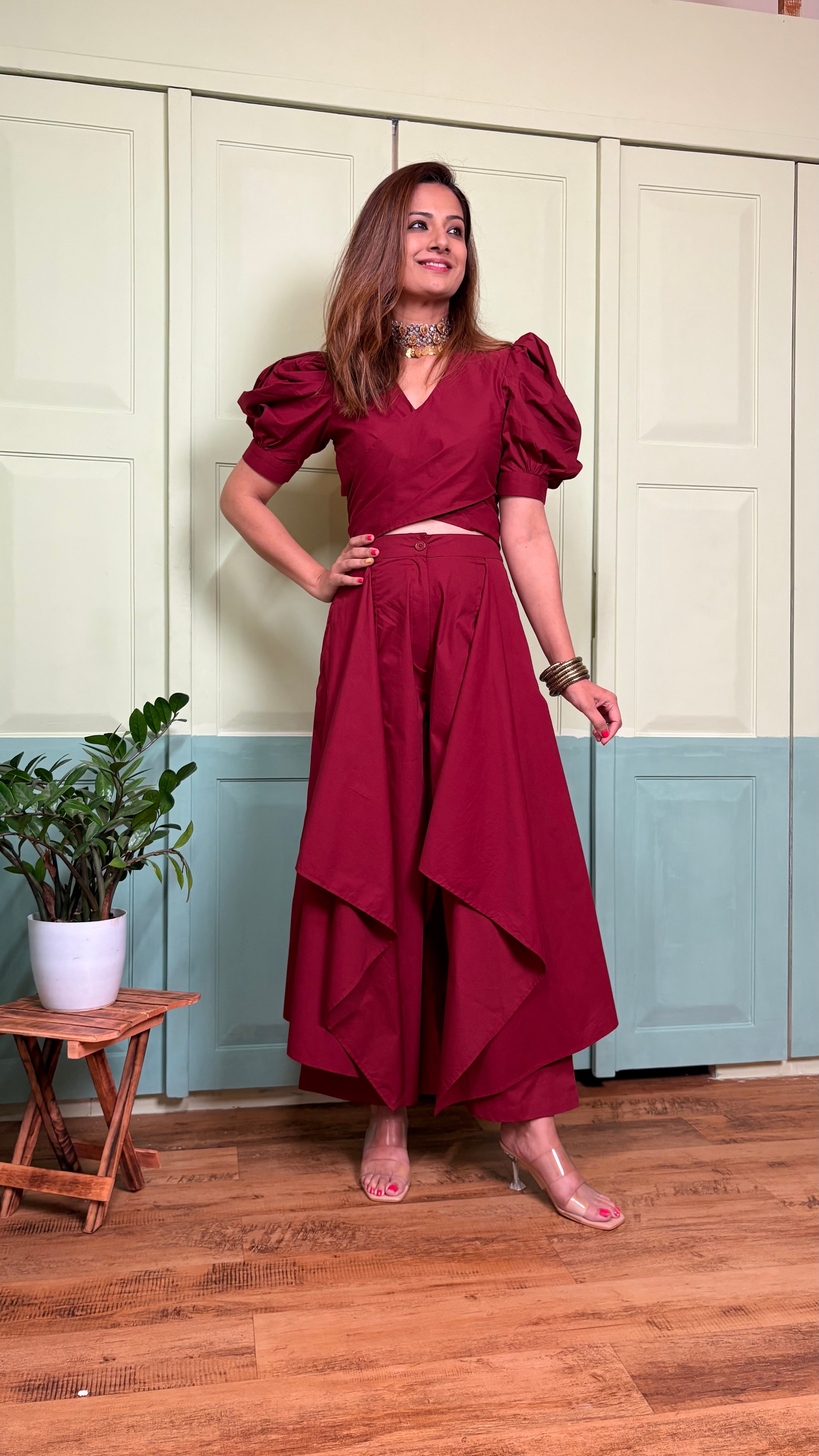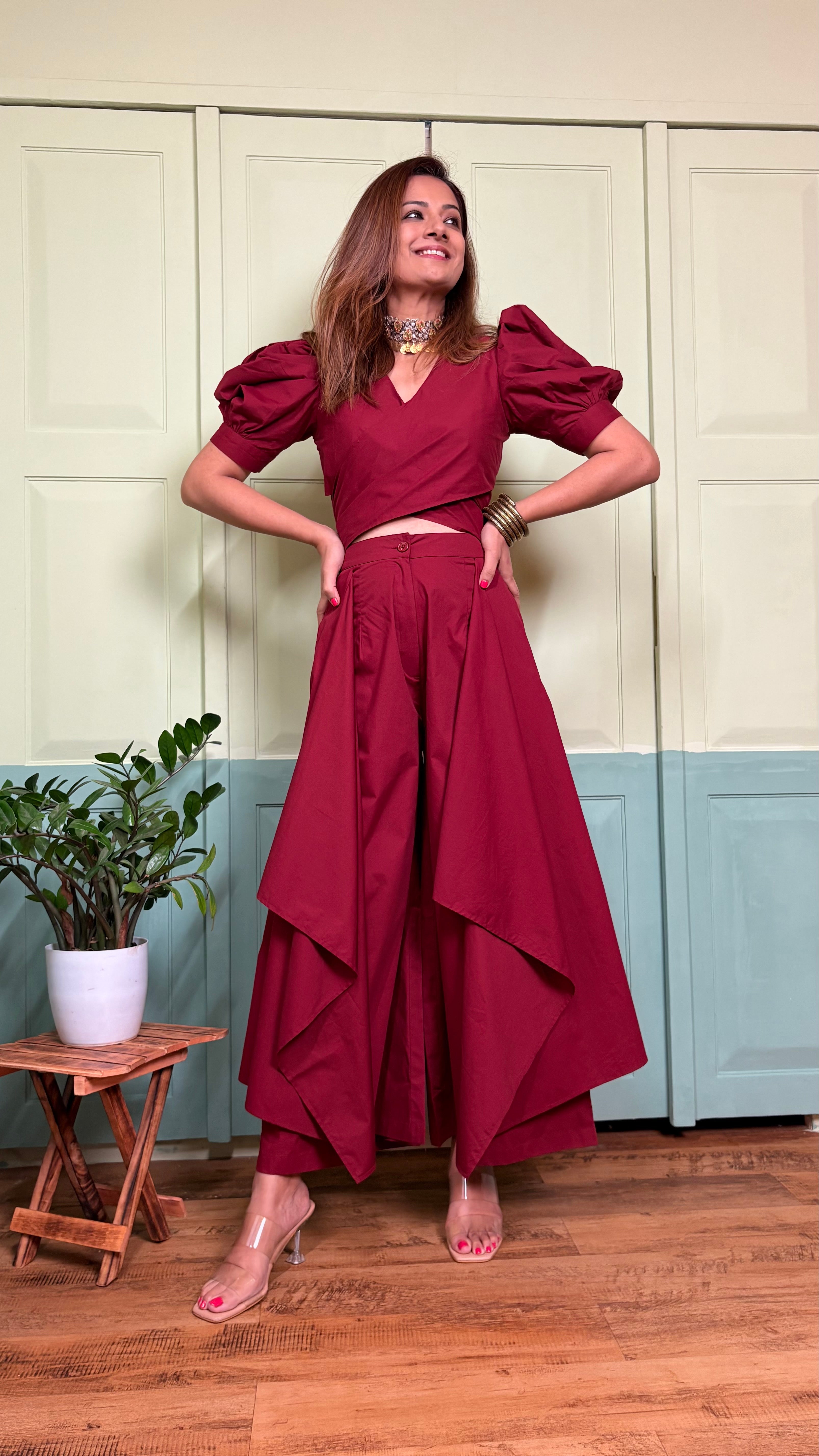 This co-ord set is style personified. The easy fit palazzos with side drapes make the outfit easily standout. Paired with a puffed sleeve and tie-around top, the set is sure to grab eyeballs when you don it. The easy breezy premium cotton fabric cools down your body and falls on it like a vision. Flatter yourself in this chic separate and strut like a queen!
