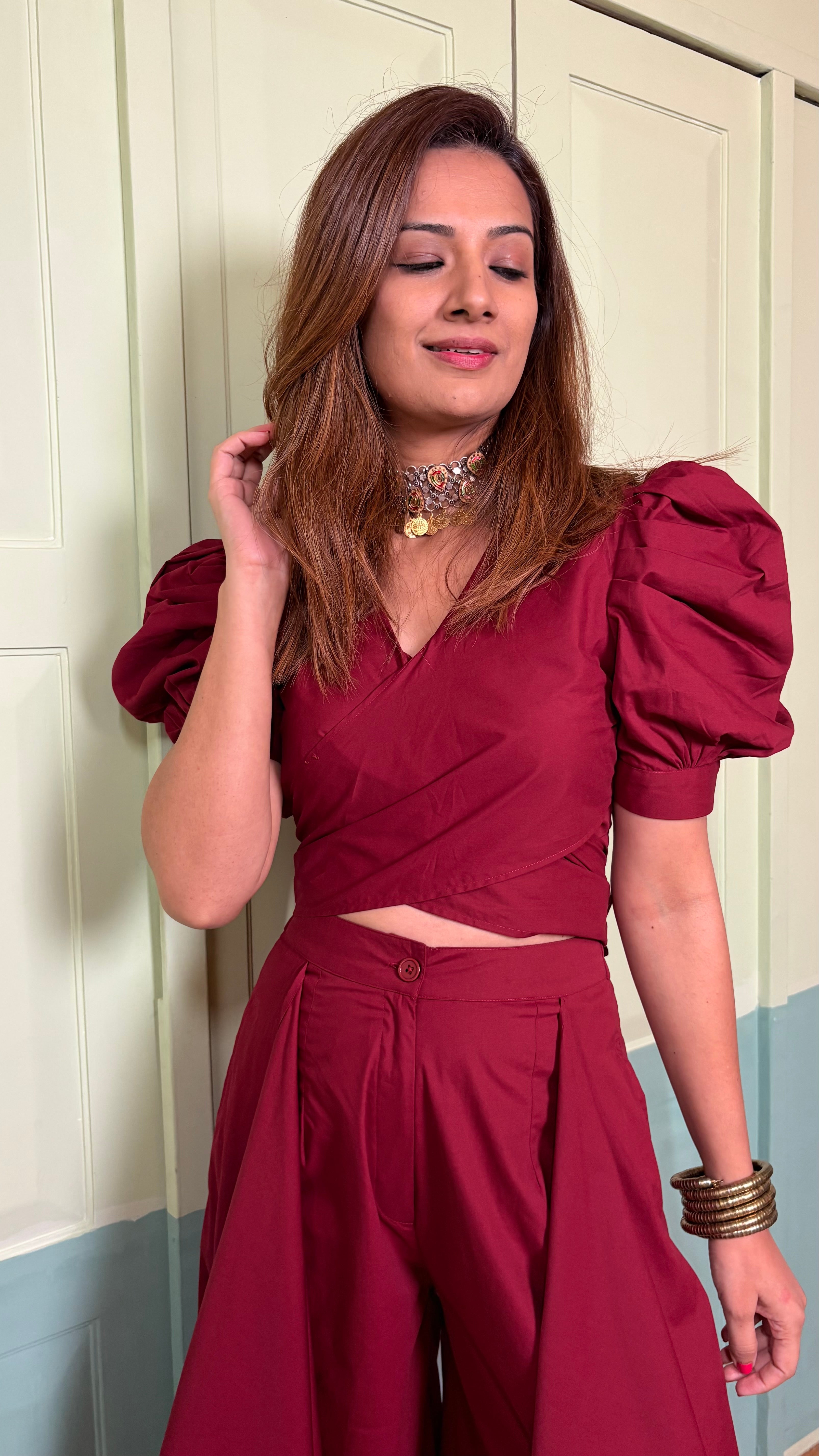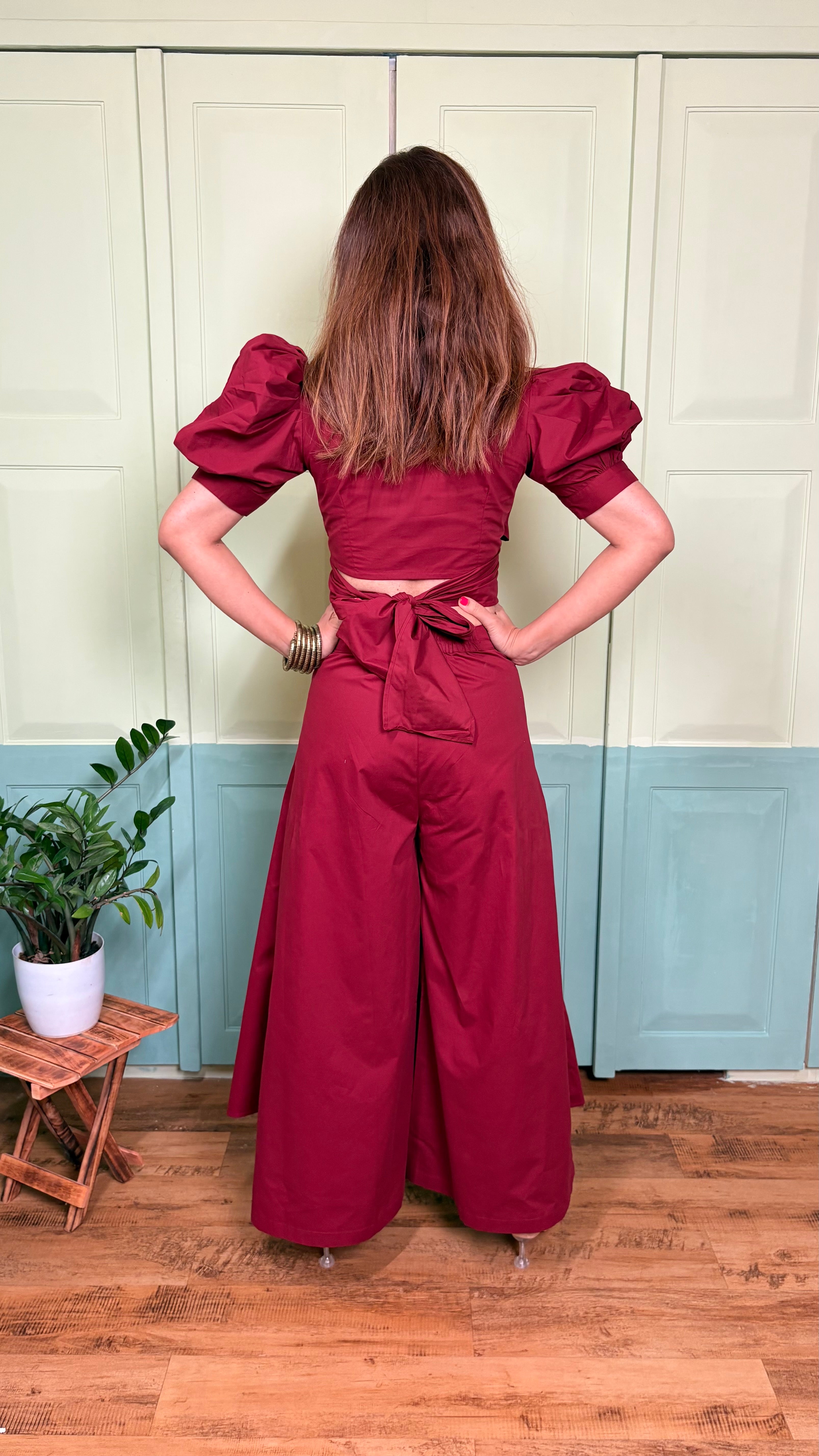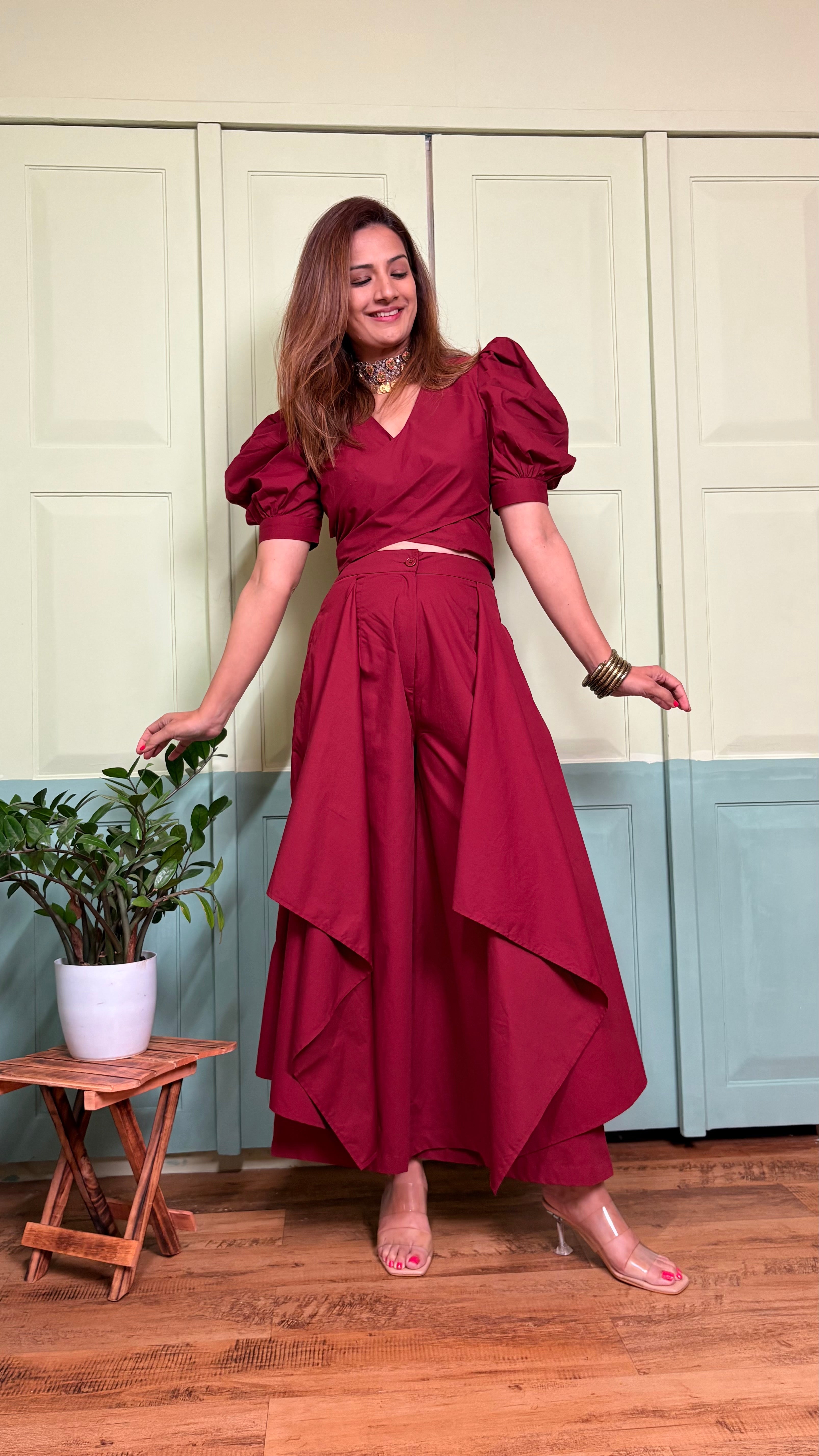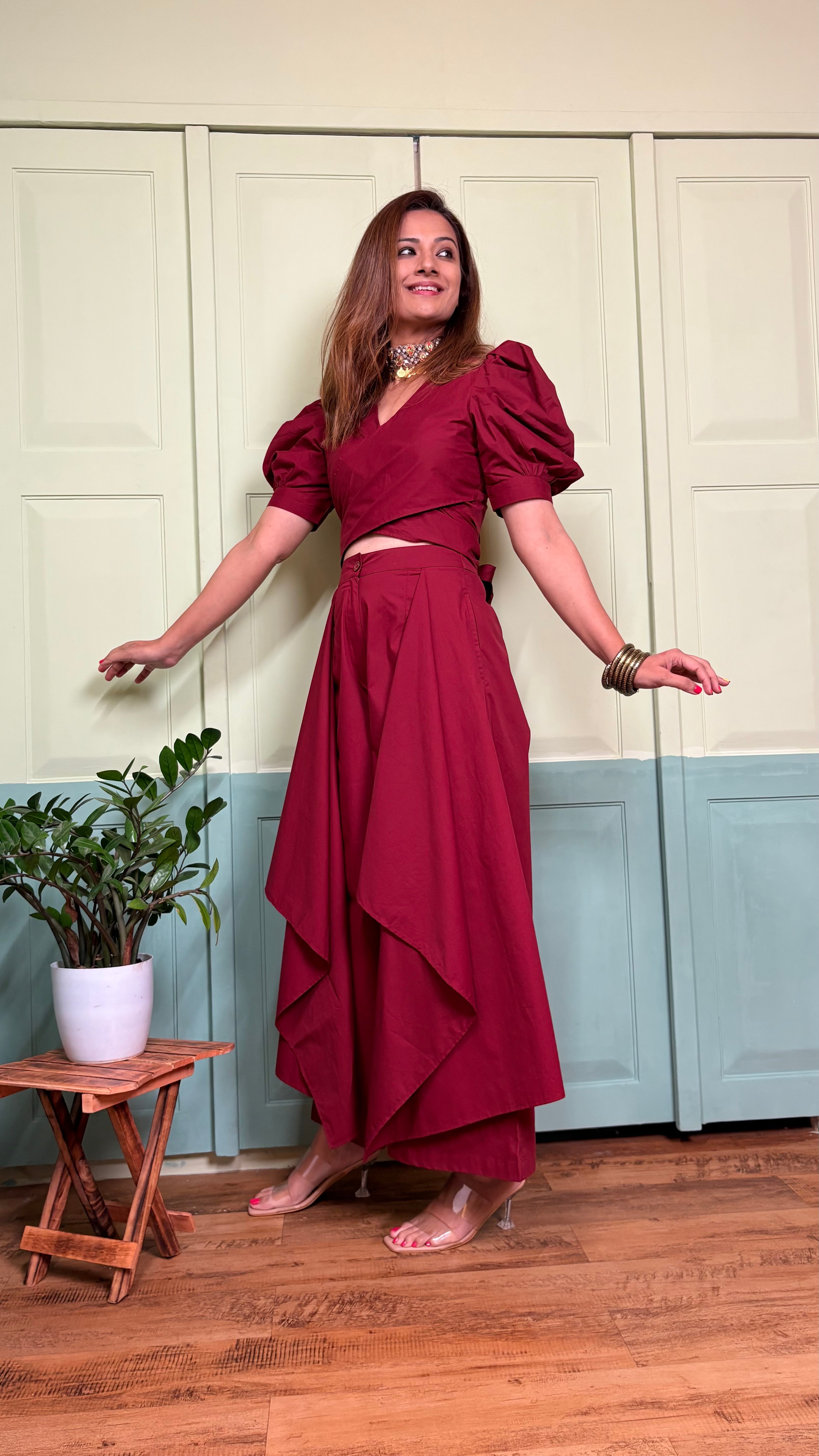 This co-ord set is style personified. The easy fit palazzos with side drapes make the outfit easily standout. Paired with a puffed sleeve and tie-around top, the set is sure to grab eyeballs when you don it. The easy breezy premium cotton fabric cools down your body and falls on it like a vision. Flatter yourself in this chic separate and strut like a queen!
