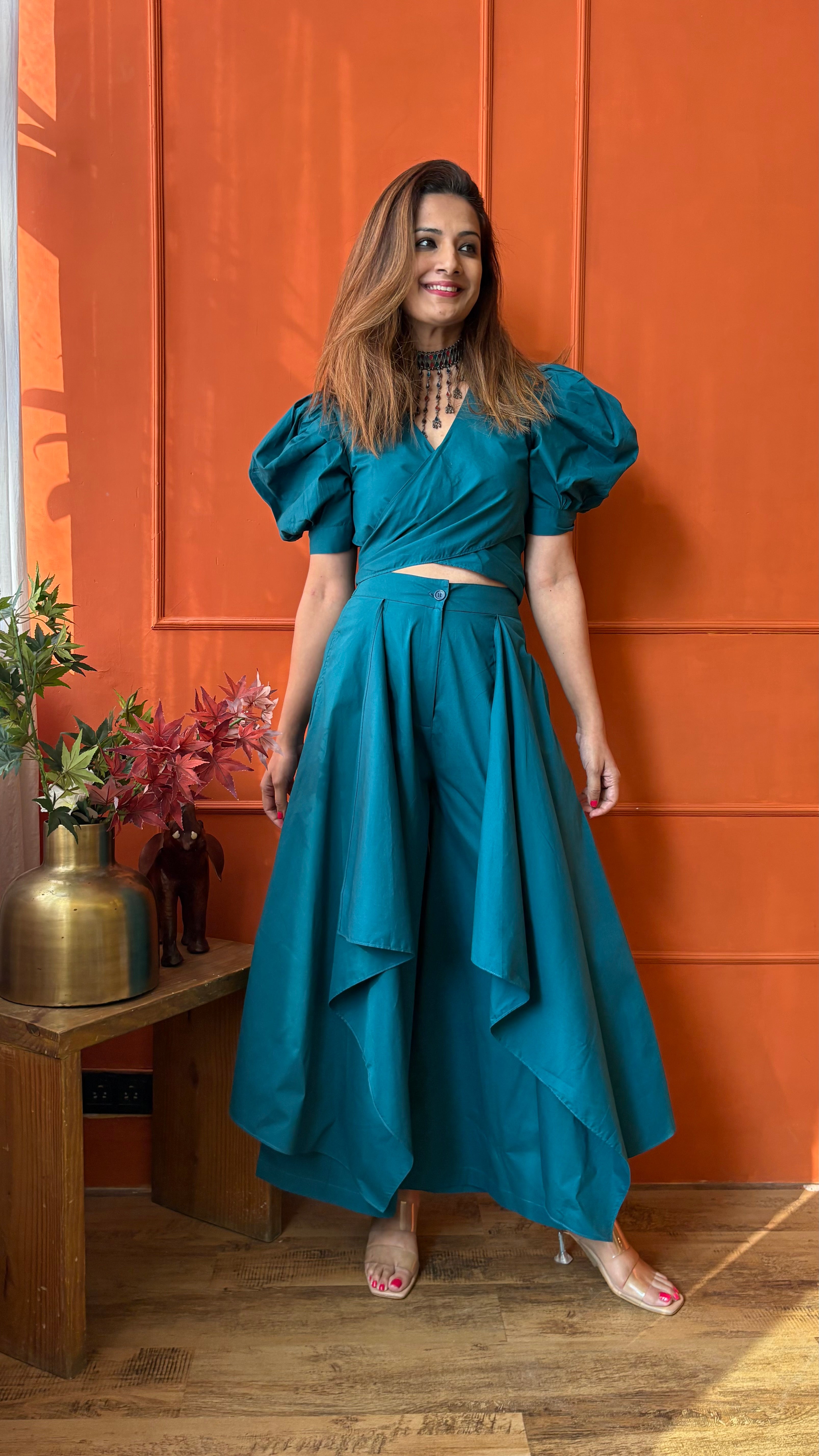 This co-ord set is style personified. The easy fit palazzos with side drapes make the outfit easily standout. Paired with a puffed sleeve and tie-around top, the set is sure to grab eyeballs when you don it. The easy breezy premium cotton fabric cools down your body and falls on it like a vision. Flatter yourself in this chic separate and strut like a queen!