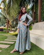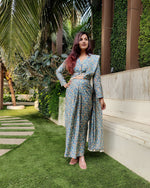 Here's a super chic Indo-western outfit. The skirt with front pleats gives a saree look and has an attached pallu to it. The shirt blouse with shell embellishments adds a quirky take to the outfit.
